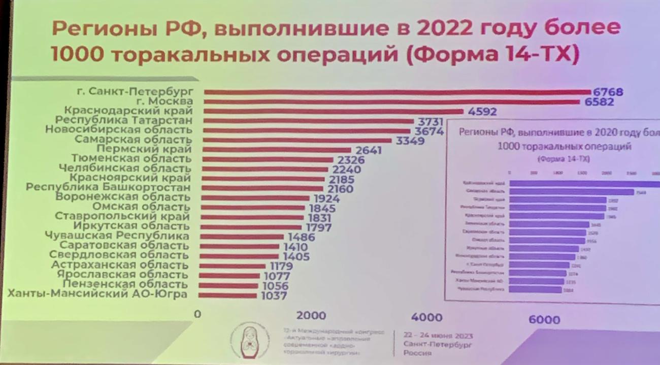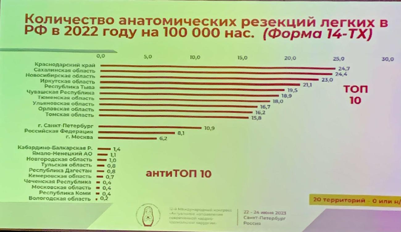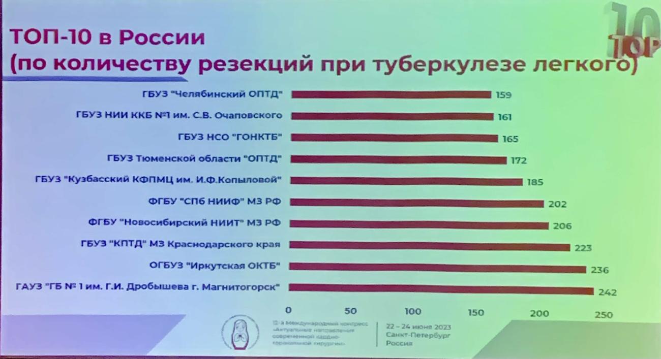 Олег Михайлович поделился фотографиями слайдов докладов, которые демонстрируют высокий уровень оказания хирургической помощи в нашем регионе и областной туберкулезной больнице, в частности. Иркутская область – в ТОП-10!