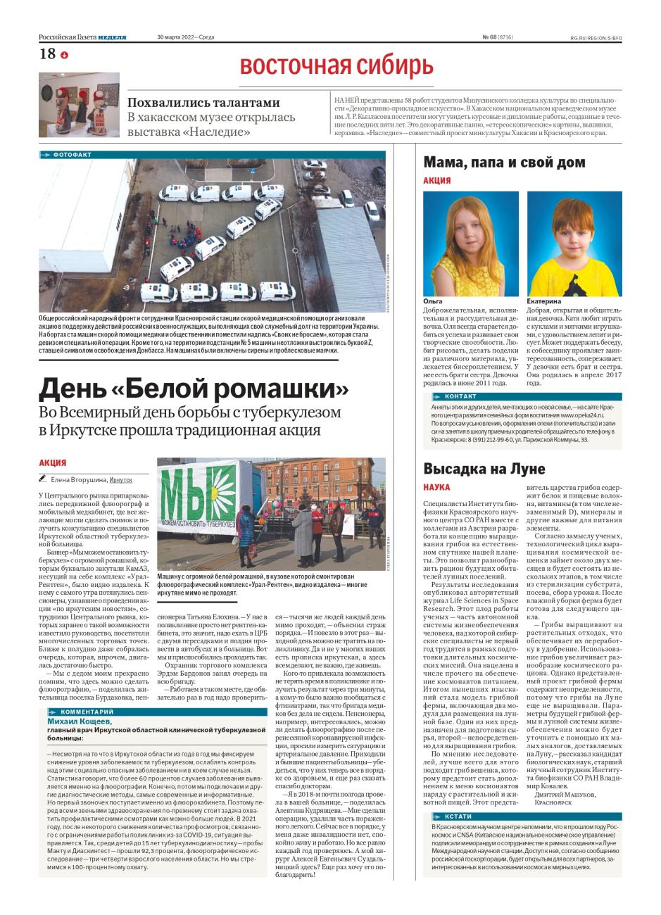 В еженедельнике "Российская газета - Неделя" № 68 (8716) от 30 марта 2022 года опубликован репортаж с акции Иркутской областной клинической туберкулезной больницы "Белая ромашка - 2022".
